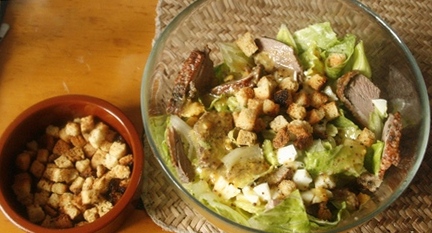 A co zrobić z pozostałościami, z resztkami, po takiej uczcie? Nie odgrzewajmy ich następnego dnia. Nie będą już tak wyborne, jak świeżo pieczone. Podajmy je na zimno. Można nimi obłożyć chleb lub bułki; ale może podać właśnie w postaci sałatki? Kluczem do jej smaku jest specjalny sos, rodzaj winegretu. To on gęsie mięso powiązał z chrupkimi liśćmi sałaty.
