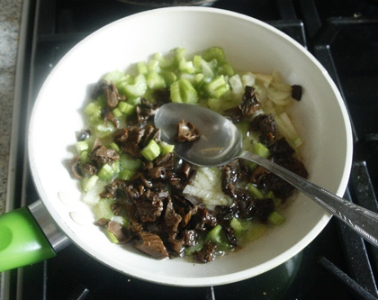 Na patelni rozgrzać tłuszcz, zeszklić cebulę, dodać seler i posiekane grzyby. Smażyć przez chwilę, mieszając. Dodać kaszę, wymieszać. Jeżeli jest za sucha, podlać wywarem z grzybów. Chwilę smażyć na małym ogniu. Podawać posypaną świeżymi listkami selera.