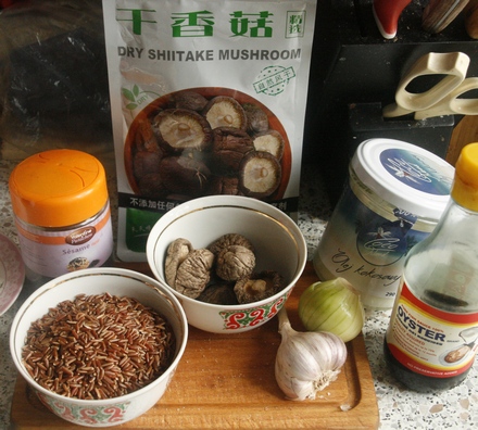 Ryż opłukać na sicie, wrzucić na cebulę z grzybami. Smażyć przez 10 minut mieszając. Wlać wywar z moczenia grzybów. Dolewać stopniowo bulion. Duszenie ryżu potrwa ok. 40 minut, przez ten czas ma być wilgotny, nie wysuszony. Gdy będzie miękki, doprawić sosem ostrygowym, posypać sezamem (można go uprażyć) i podawać.