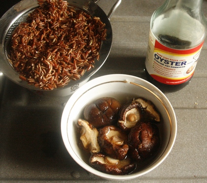 Grzyby przez godzinę namoczyć w letniej wodzie z dodatkiem łyżki sosu ostrygowego. Jeżeli są wciąż twarde, raz zagotować w tej samej wodzie, przestudzić. Odcedzić je (wodę zachować), pokroić w paski.