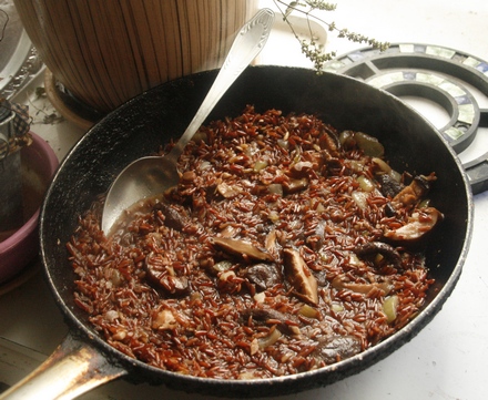 Kto kaszy nie lubi, może zechce podać ryż. Także z dodatkiem grzybów, choć innych niż w poprzednim przepisie, nie rodzimych. Także ryż jest oryginalny. To czerwony niełuskany ryż z Camargue. Jak malowniczo wyglądają jego uprawy, widziałam na własne oczy podczas naszych francuskich wędrówek. Gdyby jeszcze tam powrócić…