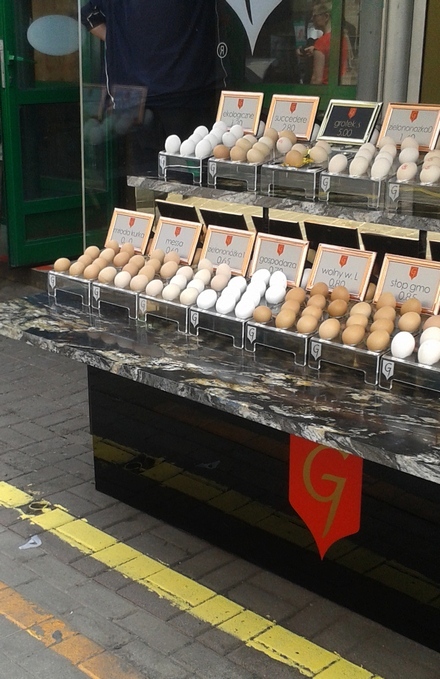 Jaja lubię kupować na bazarze. Na tym pod Halą Mirowską można znaleźć nie tylko kurze. A jeżeli kurze, to od bardzo wielu ich gatunków. Są pięknie ułożone i czytelnie opisane, a można liczyć i na fachową konsultację u sprzedawcy. Lubię je oglądać nawet wtedy, gdy żadnego nie kupuję. Bo nie są tanie. Jednak raz na jakiś czas można zaszaleć.