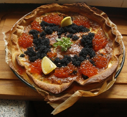 Koleje danie z udziałem jaj będzie zarazem tradycyjne – bo z jaj kurzych – i wymyślne – bo kurze połączyłam z rybimi. Czyli z ikrą. Dla uproszczenia nazywam ją kawiorem, choć wiem, że niektórzy nazwę tę rezerwują tylko dla czarnej ikry z jesiotra. Moja czarna pochodziła z ryb morskich, czerwona – z łososia. Tak przyrządzona tarta może być podana do śniadania wytwornego, spożywanego koło południa, takiego z szampanem.