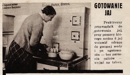A do gotowania jaj obecnie mamy specjalne elektryczne urządzonka, nazywane, jak wyczytałam, przeuroczo jajowarami (dobry prezent na Gwiazdkę dla smakoszy jaj). Nawet bym taki kupiła, gdybym miała gdzie trzymać… Znacznie mniej miejsca zajmie praktyczny gadżet pokazany już przed wojną w tygodniku „As”.