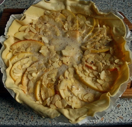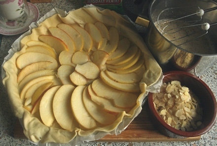 Ciasto wyjąć z lodówki 10 minut przed pieczeniem, rozłożyć razem z papierem, nakłuć widelcem. Piec 10 minut w 200 st. C. Na lekko zazłoconym cieście rozłożyć cienkie plasterki jabłek.