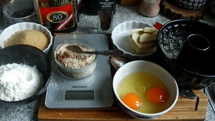 Kolejne ciasto – znowu wcale nie trudne do wykonania – można podać zamiast piernika – trudniejszego do przygotowania, a na pewno kosztowniejszego. Jest ciemne i korzenne, ma ciekawą nutę migdałową lub orzechową w zależności od dodanego składnika. Podaję proporcje na małą babkę (forma średnicy 16 cm, z kominkiem).