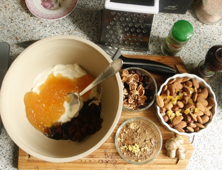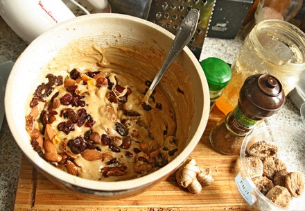 Przygotować bakalie i korzenie. Wymieszać cukier, miód i śmietanę oraz jajka. Dodać mąkę zmieszaną z proszkiem do pieczenia; ciasto ma być dość gęste. Dobrze rozmieszać z sypkimi korzeniami. Następnie wmieszać bakalie.