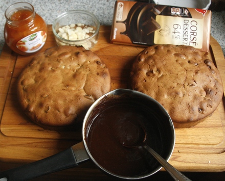 Piernik po upieczeniu przestudzić. Jeżeli był pieczony w dużej tortownicy, przekroić go na pół. Pieczony w dwóch tortownicach ułożyć jeden na drugim. Przed złożeniem przełożyć konfiturą z moreli, a następnie posmarować warstwą masy czekoladowej.