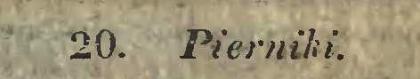 Do garnca miodu praśnego, bierze się 1/2 garnca mąki żytniej, 1/2 garnca mąki pszennej, którą się w rondlu na wolnym ogniu praży, ciągle mieszając, póki nic nabierze koloru czekulady z mlekiem i zaraz po uprażeniu przesiewa. Łut goździków, łut cynamonu, 2 gałki muszkatołowej i kawałek korzenia fijałkowego, wielkości orzecha włoskiego, tłucze się miałko. Skórki pomarańczowej za 9 groszy gotuje się tak długo, póki nic zmięknie zupełnie, i sieka się drobno. Potażu łut jeden czyszczonego i suchego, tłucze się, i nalewa mniej jak półszklanką piwa, na parę godzin przed użyciem. To wszystko przysposobiwszy, sypią się korzenie i skórka w naczynie, w którym piernik ma się wyrobić; dodaje 10 jaj całych, piwo z potażu, i na przemian obydwa rodzaje mąki wraz z miodem po trochu dodaje się, i lak długo mocno wybija, póki pęcherzyki robić się nie zaczną. Tak przysposobiona massa zostawia się przez noc spokojnie; a na drugi dzień napełniają się nią do połowy formy płaskie, najlepiej miedziane, lub w rondelku niegruba warstwa, wysmarowawszy je poprzednio woskiem białym lub żółtym, który powinien być na rozgrzanej formie równo rozprowadzonym. Pierniki wstawiają się w piec tak gorący, jak do ciasta