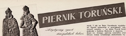 „Gdańska gorzałka, toruński piernik, krakowska panna, warszawski trzewik,– najlepsze rzeczy w Polsce!” – mówi stare przysłowie, sławiące znane z wiekowych tradycyj łakocie, któremi słynie prastary gród Kopernika. Uznanie dobroci toruńskich pierników łączy się z podziwem wytwornych artystycznych ich form, wraz z słodkim zapachem bije od nich miły wdzięk przeszłości. Ze starych drewnianych form wybiega wciąż na świat nowy korowód miniaturowych osóbek, odzianych w bogate, pompatyczne szaty: królowie, święci, bogowie, rycerze, damy, żołnierze. Te oryginalne miejscowe zabawki-łakocie, nabywane tak chętnie przez licznych turystów, znane są w całej Polsce, cieszą dziatwę, bawią i interesują estetów.