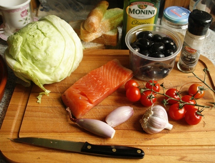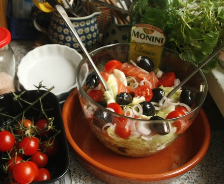 Sałatę posiekać. Salaterkę natrzeć przekrojonym ząbkiem czosnku (można go odrzucić lub przesiekać i dodać do winegretu). Włożyć do niej sałatę. Dodawać kolejno oliwki, przekrojone na pół pomidorki (kilka oliwek i pomidorków zostawić), łososia pokrojonego w jak najcieńsze plasterki. Sałatkę przybrać cebulkami lub szalotkami pokrojonymi w plasterki i rozdzielonymi na krążki. Polać winegretem z oleju, octu, soli i pieprzu. Na wierzchu rozłożyć kilka oliwek i pomidorków.