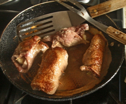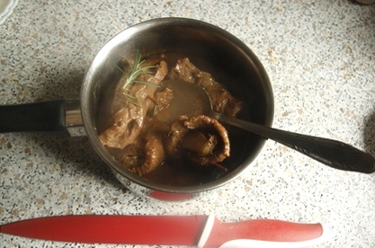 Gdy wszystkie zrazy są obsmażone, resztki na patelni zalać wodą (bulionem, winem lub wywarem z grzybów), rozprowadzić na zawiesisty sos. Zalać nim mięso w rondelku. Dusić uważając, aby nie przywarły do dna. Muszą być miękkie, ale zarazem kruche i nie rozgotowane. Spróbować, doprawić solą i pieprzem.