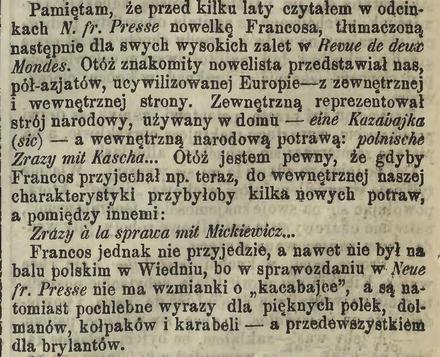 Do opisu innych dań polskiej kuchni, przytoczonego z tego tekstu, obiecuję wrócić. Na razie idę dalej zrazowym tropem. Dwa lata później, a więc w roku 1886 tenże „Kurierek”, jak pieszczotliwie nazywano gazetę w Warszawie, pisał o balu w Wiedniu. Na nim brylowała polska socjeta. Dlaczego w felietonie wspomniano o zrazach? Proszę przeczytać. Mickiewicz, równie polski jak zrazy, jest w nim wspomniany w kontekście pomnika. Powstawał przez wiele lat w Krakowie, długo trwało wybieranie autora monumentu. Rozpisany w roku 1880 konkurs budził wiele emocji, a w końcu zaczął… drażnić i nudzić.