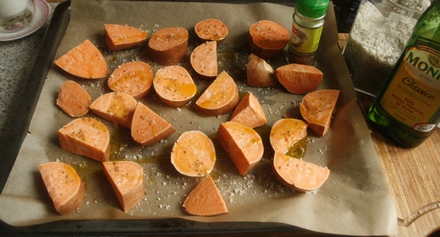 Pomarańczowe pataty nie tylko są smaczną i słodkawą alternatywą ziemniaków, ale pięknie zdobią stół. Tym razem je upiekłam. Pieczenie ich trwa krócej niż ziemniaków, zwłaszcza gdy je pokroimy na cząstki, np. grube plastry.
