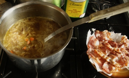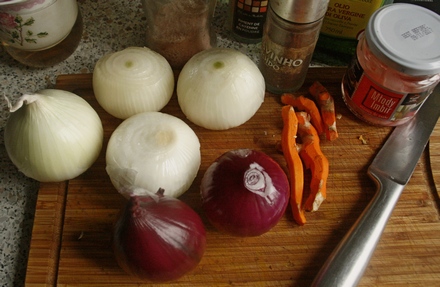 Wszystko to ciekawe, ale nie ma jak praktyka. Opowiem, jak postanowiłam podać dawno nie gotowaną zupę cebulową. Oczywiście, aby wspomagać nasz organizm w obronie przed zarazkami, bo coraz częściej słyszę o chorujących znajomych. Zwykle taką zupę gotuję bardzo prosto: uduszoną cebulę zalewam bulionem lub po prostu wodą, doprawiam i podaję z grzankami zapieczonymi z żółtym serem. Nalewa się zupę na nie lub zapieka je na jej powierzchni tuż przed podaniem. Podałam już w blogu przepisy na paryską cebulową z Hal oraz na słynną zupę cebulową Przypkowskich, której przepis udostępnił Tadeusz Przypkowski, historyk i znany smakosz.