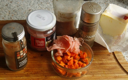 Kurkumę i imbir przesiekać lub drobno pokroić. Dorzucić do cebuli razem z płaską łyżeczką goździków oraz solą, cukrem i cayenne do smaku (od 1/2 do 2 łyżeczek; zależnie od tolerancji na ostrość). Z patelni zdjąć pokrywkę, na większym ogniu smażyć cebule, aby się lekko zaczęła brązowić. Koniecznie trzeba mieszać, aby się nie spaliła. Zalać 1/2 l wody jeszcze na patelni lub po przełożeniu do garnka (zamiast wody można wziąć bulion wołowy lub warzywny). Gotować przez 15 minut.