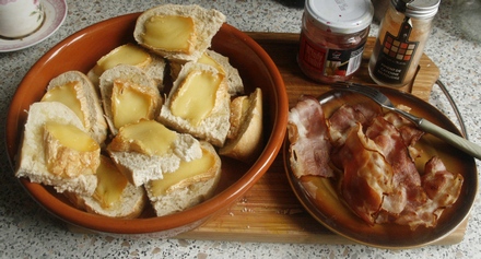 W tym czasie w piekarniku podpiec grzanki z oliwą lub masłem i serem (dałam Livarot), a na suchej patelni wysmażyć plasterki boczku. Dla odsączenia z tłuszczu odkładać je na papier kuchenny.