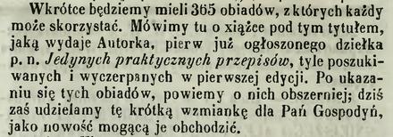 Wspomniane w notce zapowiadającej „365 obiadów” dziełko pt. „Jedyne praktyczne przepisy konfitur, różnych marynat, wędlin, wódek, likierów, win owocowych, miodów oraz ciast” ukazało się dwa lata wcześniej i także było reklamowane w „Kurierze”. Tak zaczęła się wielka kariera Lucyny Ćwierczakiewiczowej – autorki ambitnej, bardzo pracowitej i potrafiącej zadbać o swój wizerunek. Dzięki gazetowej notce wiemy, gdzie mieszkała. Jak i to, że pierwszą książkę wydała własnym nakładem.