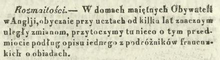 W domach majętnych Obywateli w Anglji, obyczaie przy ucztach od kilku lat znacznym uległy zmianom, przytoczymy tu nieco o tym przedmiocie podług opisu iednego z podróżników francuskich o obiadach.