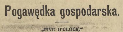 – No widzę teraz, droga moja Klociu, że panuje nietylko rozmaitość, lecz i dziwna rozbieżność w urządzaniu five o clock’ów. Lecz właśnie to ci daje zupełnie wolną rękę. Będziesz zupełnie oryginalna, jeśli dasz dobrą kawę ze swemi znakomitemi nalewkami, herbatę ze śmietanką i cytryną, faworki – tylko domowe, pączki z dobrej cukierni, a jeśli się ułożą tańce, lemonjadę i lekki kruszon. Nakoniec możesz się zrujnować na paterę dobrych jabłek i mandarynek. Co ci to szkodzi, jeśli powiedzą, że jesteś kobieta oryginalna.