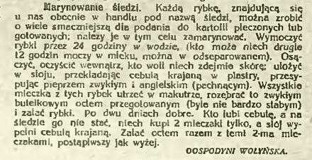 Nie oprę się zamieszczeniu jeszcze dwóch bardzo ciekawych przepisów na przyrządzanie śledzi. Oba dojmująco ukazują czasy, w których je wydrukowano. A były niełatwe. Biedne, pełne prawdziwego niepokoju, a nawet wręcz tragiczne. Przez co te nasze prababcie musiały przechodzić… I zawsze, zawsze umiały sobie radzić.