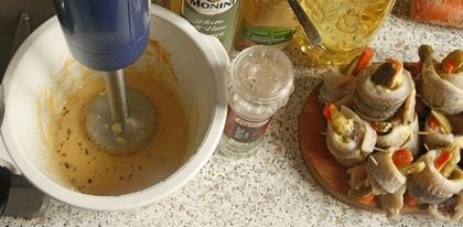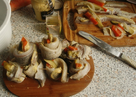 Wymoczone płaty śledziowe smarować musztardą. Układać na nich kilka piórek cebuli, słupek marchewki i ogórka, zawijać, spiąć wykałaczką. Układać w dwóch naczyniach. Jedne rolki zalać olejem połączonym z łyżeczką wywaru. Drugie sosem majonezowo-musztardowym.