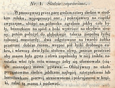 W rozpoczynającym się poście śledzie jadali więc i bogaci, i biedni, i panowie, i ich poddani. Różnie przyrządzane, na początku chętnie witane, ale potem – obecne do znudzenia. Ciekawy przepis na ich przyrządzenie znalazłam w książce kucharskiej, która ukazała się rok przed cytowanym wierszykiem. Niewykluczone więc, ze jego autor właśnie takiego śledzia jadał. Wydawane wtedy książki na ogół były tłumaczeniami z niemieckiego. Czy tak było z tą bez ujawnionego autora? Nie wiem.