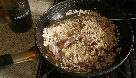 Na patelni o grubym dnie rozgrzać oliwę, masło klarowane lub ich połączenie. Wrzucić cebulę pokrojoną w kostkę, a po chwili ryż. Smażyć mieszając, aby każde ziarenko było obtoczone w tłuszczu. Wlać szklankę białego wina lub wodę.
