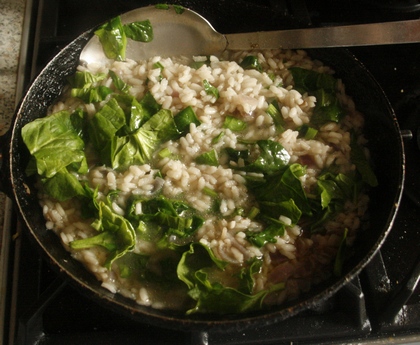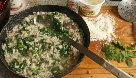 Szpinak uwarzyłam bez rodzynków. Jako włoskie z pochodzenia risotto. Oczywiście, z okrągłego ryżu.