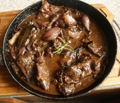 Dusić pod przykryciem co najmniej przez dwie godziny. Od czasu do czasu zaglądać, jeżeli potrzeba dolewać wina lub wody. Pod koniec duszenia, gdy mięso już dostatecznie zmiękło, sos doprawić do smaku.