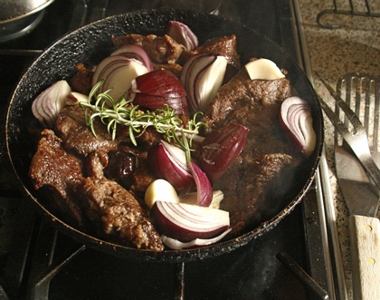 Mięso udusiłam na patelni z całą gamą dodatków. Z efektu byłam zadowolona – potrawa miała głęboki, wielowarstwowy i intrygujący smak. Dodatek dobrego wina – tak do sosu, jak i potem wlanego do kieliszków, dodatkowo go podkreślił. Proporcje składników dania są orientacyjne i można je dopasować do swojego gustu.