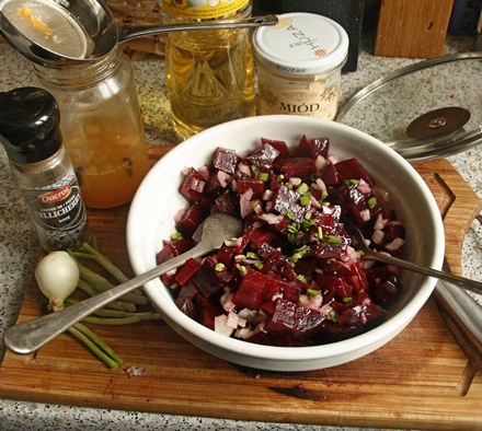 Dodatkiem do dania mięsnego była u nas zielona sałata z winegretem oraz sałatka z gotowanych buraczków. Jej słodkawo-kwaśny smak podkreślał mocno mięsną dominantę obiadu. Słodycz sałatce zapewnił miód, kwaskowość zaś ocet pozostały po marynowanej dyni. W jego miejsce można wziąć ocet z marynowanych śliwek lub gruszek. Pod żadnym pozorem i nigdy takiego octu nie wolno wylewać. W lodówce można go przechowywać długo i doprawiać nim sałaty i sałatki. Będą smakowały nieprzeciętnie dobrze.