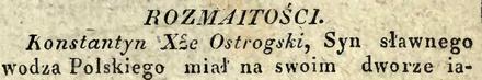 Konstantyn Xze Ostrogski, Syn sławnego wodza Polskiego miał na swoim dworze iakiegoś Bohdana, ten na śniadanie zjadał prosie pieczone, gęś, 2 kapłony, pieczenią wołową, chleba 3 bochny, ser cały, miodu garcy 2; po tem wszystkiem do obiadu tak siadał iakby nic nie iadł; przy którym spożył mięsa wołowego sztuk 10, cielęcego ieszcze więcej, baraniego Więcej niż cielęcego; prosię pieczone, gęś, kapłon, pieczeni 3, wołowa, cielęca i wieprzowa; miodu, wina, gorzałki na przemiany po garcy 4, piwa bez miary, z tem wszystkiem nie był wcale otyły, tak był silny, że mógł na 30 uderzyć, nigdy się nieupił, po każdem iedzeniu tak wstał od stołu, żeby mógł ieść ieszcze więcej.
