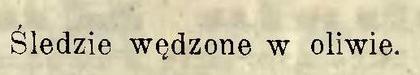 Wędzone śledzie sparzyć ukropem na dwie minuty, nie dłużej, następnie nalać zimną wodą na 6 godzin, obrać ze skórki, wyjąć kość środkową, a same grube długie kawałki od grzbietu ostrożnie obrać i układać w puszki blaszane lub słoiki szklanne wysokie – nalać dobrą nicejską lub prowancką oliwą, zawiązać papierem albuminowym, a będą wyborną zakąską po wódce. Trzymać je można w zimnej śpiżarni kilka miesięcy.