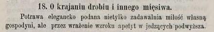 Dla gospodyń nie mających kucharza, wielką trudność w tym przedmiocie stanowi ładne pokrojenie pieczystego (…) choć to rzecz nie łatwa objaśnić słowami najlepiéj z przykładu się uczy. Od każdego drobiu czy to na pieczyste, czy na potrawę, po oczyszczeniu odkroić w stawach, nie odrąbywać, bo ostre koście wystawać będą, szyję, nóżki i skrzydła, ściągając o ile możliwości skórkę z szyi, aby została przy piersiach i grzbiecie, gdyż po ugotowaniu lub upieczeniu kurczy się skórka i brzydko wyglądają piersi, jakby odarte ze skóry; na to należy pilną uwagę zwracać.