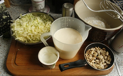 Cukinie obrać, zetrzeć na tarce z większymi oczkami. Piniony i migdały uprażyć, cały czas mieszając, na suchej patelni.