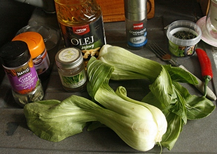 Zwykle na stole staram się stawiać surówkę i warzywa poddane obróbce cieplnej, jak mawiają technolodzy żywienia. Do ryby, lekko tajskiej z charakteru, podałam wschodnią jarzynę. Chińską kapustę pak choi. Można ją znaleźć już nie tylko w sklepach z żywnością orientalną. Kupiłam ją w hipermarkecie. Przyrządza się ją szybko. Właściwie im szybciej, tym lepiej. Byle tylko złapała ciepło, ale nie przestała być miło chrupka.