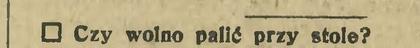 Rozpowszechniony ostatniemi czasy zwyczaj palenia papierosów podczas obiadu, po każdej potrawie, znalazł ostry sprzeciw ze strony smakoszów i kuchmistrzów francuskich. Wogóle [tak pisano!] prawem towarzyskiem śród ludzi dobrze wychowanych jest we Francji zakaz palenia przy stole, choćby nawet nikt przeciwko temu nie protestował. Smakosze zaś uważają palenie podczas obiadu lub bankietu wprost za barbarzyństwo, gdyż dym tytoniowy znieczula smak i pozbawia prawdziwego smakosza przyjemności spożywania dobrych rzeczy.
