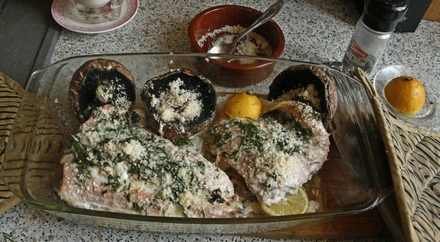 Wstawić na 20 minut do piekarnika nastawionego na 180 st. C. Posypać serem rybę i grzyby, polać roztopionym masłem spod pieczenia, a jeżeli go za mało, dołożyć po plasterku świeżego. Zapiekać jeszcze 5–10 minut zależnie od grubości filetów (w najgrubszym miejscu sprawdzić, czy nie surowe).