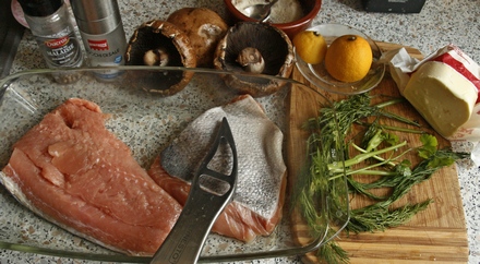 Łososia oczyścić z ości i łusek. Obmyć, wysuszyć. Ułożyć w naczyniu do zapiekania. Posolić i popieprzyć, skropić sokiem z cytryny. Obłożyć masłem nie żałując go. Posypać posiekaną zieleniną. Obok dać podobnie potraktowane pieczarki.