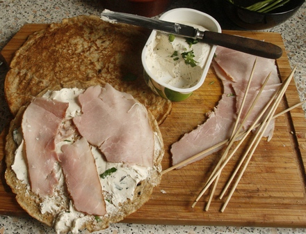 Twarożek można posypać pieprzem lub sypką papryką. Można wziąć serek kozi lub w innym smaku, doprawić go przecierem pomidorowym lub drobno posiekaną papryką. Dodać kapary lub posiekane oliwki. A zamiast szynki dać cienkie plasterki wędzonego łososia. Tu liczy się tylko pomysłowość. Proszę, danko z resztek (czyli naleśników czekających w lodówce na zmiłowanie), a wykwintne.