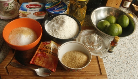 Połączyć składniki sypkie: przesianą mąkę, proszek do pieczenia, sodkę i sól. Połączyć składniki mokre: mikserem utrzeć jajka z dwoma rodzajami cukru, dolewać jogurt, olej, 6 łyżek soku z limonki. Wsypać startą skórkę i wanilię. Składniki mokre połączyć z sypkimi.