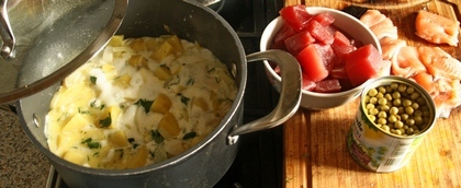 Uwielbiam zupy rybne. Ale tym razem chciałam ugotować coś treściwszego. Coś jakby gulasz z ryb, a może zresztą rodzaj rybnego Eintopfu. Czyli dania jednogarnkowego, bogatego w składniki. Aby wystarczyło za cały obiad. Efekt znakomity, choć składniki bardzo proste. Użyłam dwóch gatunków ryb. Z warzyw zaś ziemniaków, cebuli i groszku. To wszystko gotuje się szybko, przyrządza bez zachodu – czegóż chcieć więcej. Drogi zwykle tuńczyk z połowów zrównoważonych bywa sprzedawany w postaci okrawków, znacznie w cenie przystępniejszych. Danie jest więc i stosunkowo tanie. Co przed świętami także może się liczyć.