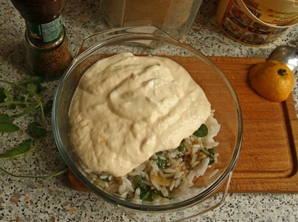 Masłem natrzeć foremkę do zapiekania. Wyłożyć do niej ugotowany ryż, wymieszać z drobno pokrojonymi bananami i posiekanymi listkami mięty. Do smaku przyprawić solą i cukrem.