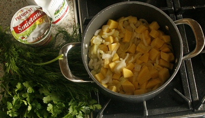 W garnku rozgrzać masło, wrzucić zwykłe cebule, pokrojone w cienkie półplasterki, dusić 2 minuty, dorzucić podobnie pokrojoną cebulę czosnkową, a potem 2 posiekane lub roztarte ząbki czosnku. Ziemniaki obrać, pokroić w kostkę, dorzucić do cebuli. Zalać wrzącą wodą, posolić, gotować 10 minut.