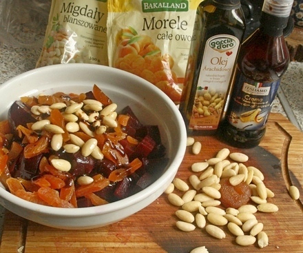 Buraki pokroić w kostkę, morele w paski. Migdały lekko uprażyć na suchej patelni. Te składniki połączyć w salaterce. Skropić olejem, kremem balsamicznym, przyprawić do smaku.