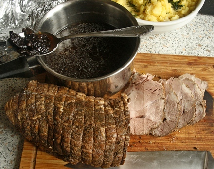 Jest to przykład klasycznej pieczeni na dziko. Polacy zawsze lubili dziczyznę, a że nie zawsze była dostępna, szukali jej smaku w innych mięsach. Marynata z jałowcem pachniała lasem i poczciwego wieprza zamieniała w dzika. Ziarna jałowca warto zgnieść, aby oddały więcej aromatu. Do pieczeni na dziko także pasują buraczki. Albo czerwona kapusta, na przykład duszona w czerwonym winie. Ale jeszcze lepiej staropolska marmolada z głogu. Tylko kto z nas ją ma w zapasach?!