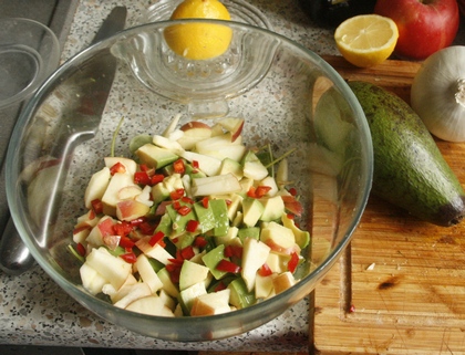 Na spodzie wysokiej salaterki ułożyć połowę rukoli. Na nią wyłożyć połowę awokado z jabłkiem oraz drobno posiekaną połowę cebuli i chili (jeżeli lubimy ostre smaki, nie czyścimy jej z pestek i błonek; gdy wolimy jeść mniej ostro – czyścimy z tego i obmywamy w zimnej wodzie).