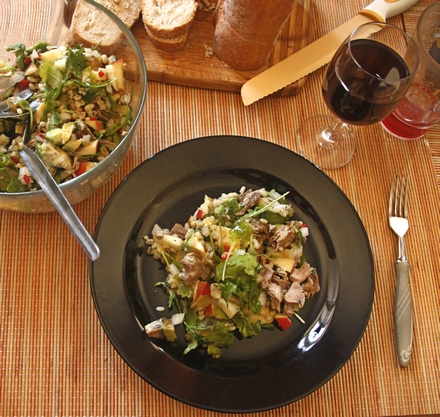Z obiadu zostały nam jednak resztki. Wykorzystałam je następnego dnia do sporządzenia treściwej sałatki. Gorąco polecam ten sposób podania drobiu na drugi lub trzeci dzień (oczywiście, po przetrzymaniu w lodówce). Nic nie gotujemy, tylko kroimy. Mamy obiad szybki i zdrowy, a jaki smaczny!