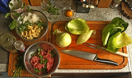 Główkę kapusty obgotowywać we wrzącej, osolonej wodzie. Nacinać liście wokół głąba i kolejno je z główki zdejmować. Rozdzielić je na dwie połowy, a najmniejsze, te wokół głąba, drobno posiekać. Przygotować farsz mięsny z wołowiny, natki i posiekanej kapusty, doprawić solą i pieprzem. Obgotować ryż (przez połowę czasu przeznaczonego na ugotowanie), wymieszać z bananem pokrojonym w plasterki i posiekanymi listkami mięty; doprawić do smaku solą i pieprzem. Farszami wypełnić liście kapusty (ich rdzenie lekko naciąć, zmiękczyć trzonkiem noża, najgrubsze wyciąć). Nie przejmować się, że małe listki się otworzą.